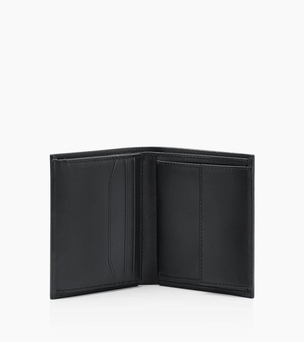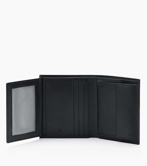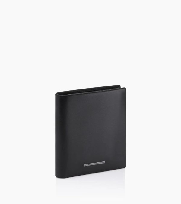 Compact trifold wallet for men by Porsche Design. This smooth leather wallet holds six cards, plus bills, ID, and business cards.An elegant blend of style and functionality. Meet the Porsche Design Classic Collection. Made from high-quality, smooth leather in black with a seamless finish, the chic exterior, featuring the signature Porsche Design metal logo tag, gives the compact Porsche Design Classic Wallet 6 its timeless and minimal look. With high-quality interior styling, signature details, and a smart design, this vertical trifold wallet is impressively spacious and functional. With six card slots, one coin pocket with a popper fastening, one pocket for bills, one mesh pocket for ID, as well as one larger pocket for things like business cards, this wallet has plenty of space for all your essentials.