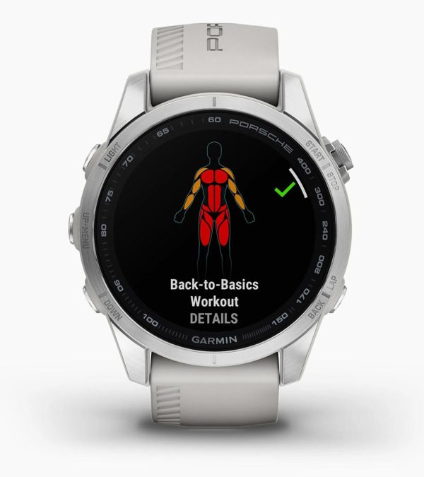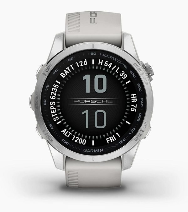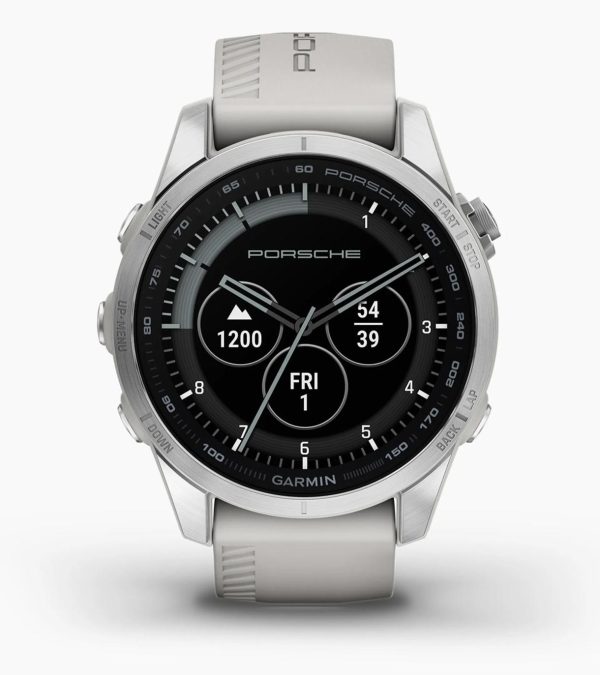 GPS multisport smartwatch with unique Porsche details and extensive fitness and health features. The watch face can be configured with a Porsche Crest, Porsche logo or 12 different vehicle logos.