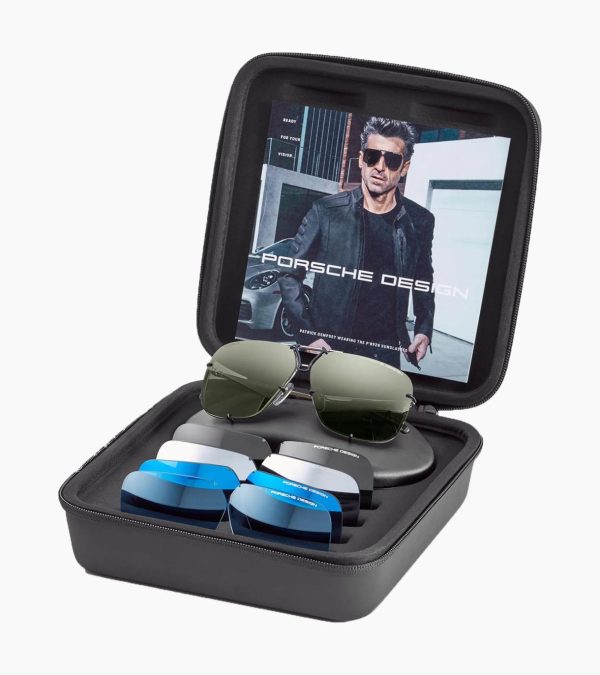 The new Porsche Design sunglasses with interchangeable lenses. Modern Squared Aviator shape with exclusive quick-lock change and lightweight frames made from 100% titanium.