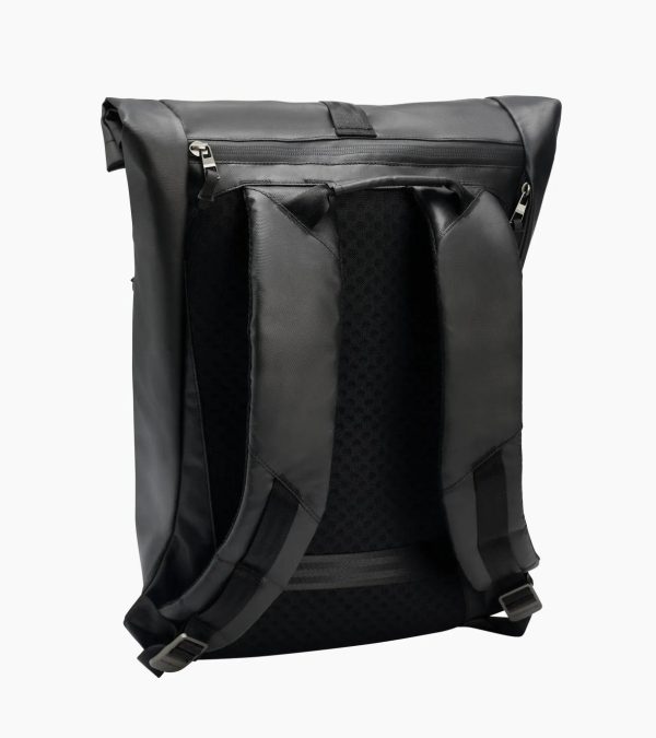 Porsche Lifestyle roll-up backpack: smart design for on the go. Made of tarpaulin material, with 3D Boxster branding.Stylish on the go: the Porsche Lifestyle roll-top backpack made of tarpaulin material combines design and function. The spacious main compartment, a separate laptop compartment and various slot and zipped compartments for smaller accessories such as keys and wallets offer plenty of storage space. The front bears the Porsche crest and the three-dimensional Boxster brand logo with a blue background. The padded back made of mesh material and the ergonomically shaped, padded shoulder belts ensure optimal carrying comfort. The additional zip compartments with blue zip tape on the front are a visual highlight and offer additional storage space.