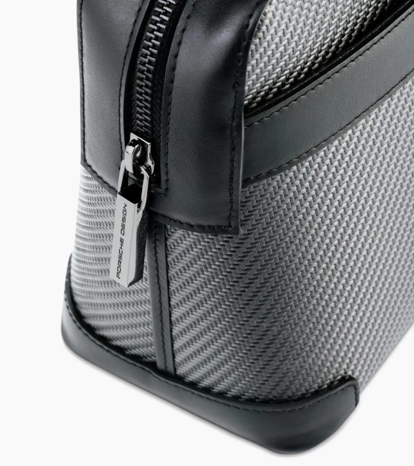 Exclusive toiletry bag from Porsche Design with practical interior layout.The thrill of carbon: the high-tech material from motorsport gives the wash bag – like all models in the Carbon Collection – its unmistakable design DNA. Light, structured carbon-fibre fabric and the finest box calf leather are combined with in an iconic, minimalist design to make the toiletry bag an exclusive, timelessly stylish accessory. Flexibility on the go: you can use the wash bag to safely store day-to-day toiletry products as well as electronics and other small essentials. The slide-in pocket with magnetic closure on the front is perfectly in keeping with the wash bag’s clean look, which is rounded off by high-quality metal accessories with a galvanised gunmetal finish.