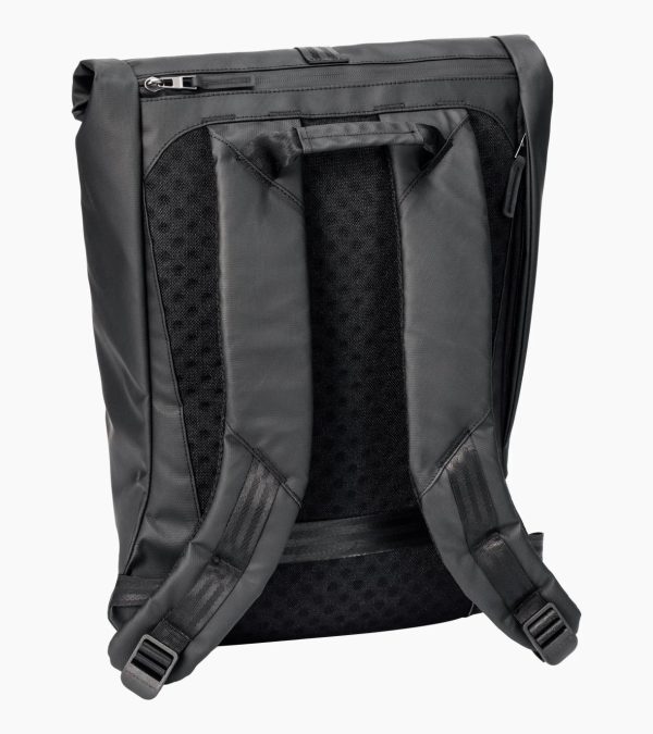 Spacious Porsche roll-top backpack with ‘Cayenne’ logo on the side and functional notebook compartment.Hit the road in style: the Porsche Lifestyle roll-top backpack made of tarpaulin material combines design and function.The spacious main compartment with separate notebook compartment is ideal for those who like to work in nature. There is also a safe place for small essentials in the slot and zipped compartments. The padded mesh back and the adjustable and ergonomically shaped shoulder straps guarantee particularly a high level of comfort. The shiny 3D Porsche Crest on the front is an optical highlight. The exclusive look of the backpack is rounded off by details such as the ‘Cayenne’ logo on the side and the reflective zip tape.
