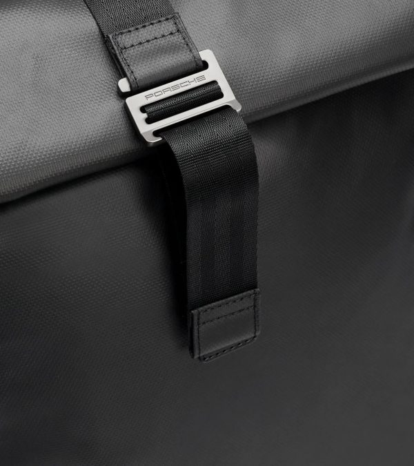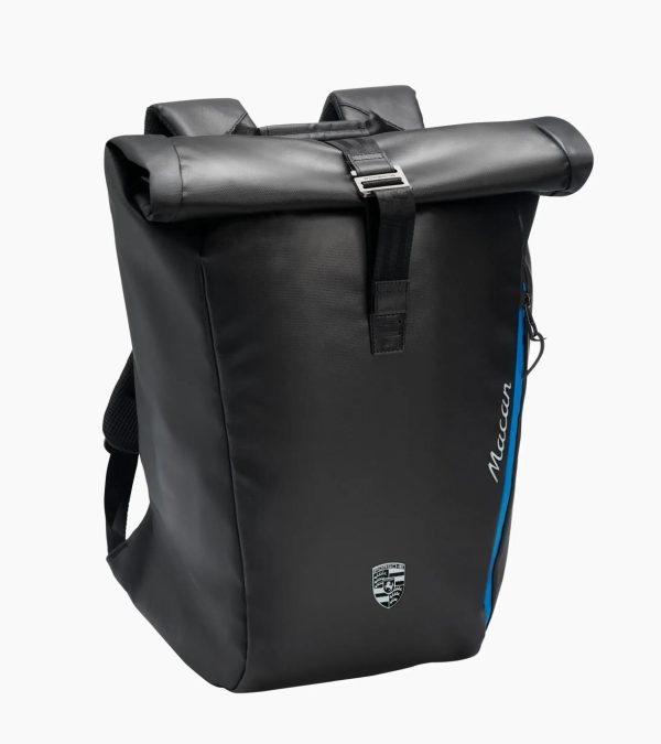 Porsche Lifestyle roll-up backpack: smart design for on the go. Made of tarpaulin material, with 3D Macan branding.Stylish on the go: the Porsche Lifestyle roll-top backpack made of tarpaulin material combines design and function. The spacious main compartment, a separate laptop compartment and various slot and zipped compartments for smaller accessories such as keys and wallets offer plenty of storage space. The front bears the Porsche crest and the three-dimensional Boxster brand logo with a blue background. The padded back made of mesh material and the ergonomically shaped, padded shoulder belts ensure optimal carrying comfort. The additional zip compartments with blue zip tape on the front are a visual highlight and offer additional storage space.