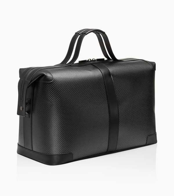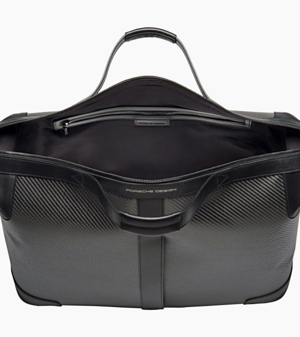 Designer weekender in the exclusive Porsche Design style in carbon and napa leather. The modern version of the classic men’s travel bag.The fascination of carbon. This high-tech material from the motorsport industry imbues the Porsche Design carbon collection with its distinctive design DNA. The award-winning Porsche Design Carbon Weekender marries smart lightness and the exceptional high performance of carbon with minimalist design and maximum functionality. Exclusive black napa leather details accentuate the characteristic graphic structure of the carbon fiber material and emphasize the distinctive character of this men’s travel bag.The technical design is further underlined by the functional features of the weekender with a smooth, oversized two-way zipper and side press studs in gleaming black galvanized metal. This is no mere travel bag. It’s a statement