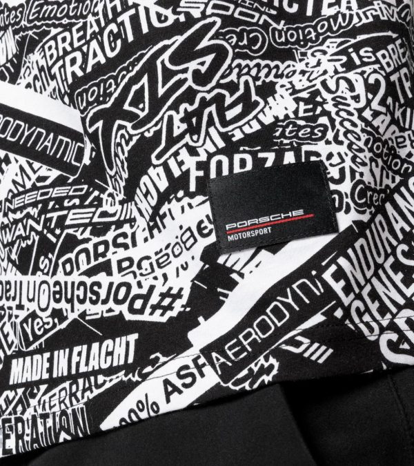 Sporty unisex T-shirt from Porsche with a slightly oversized cut.Racing spirit, stylish design and quality combined in a single collection – with Motorsport Fanwear. The unisex T-shirt made from 100% organic cotton with a contrasting collar is a real eye-catcher with its all-over print, inspired by the camouflage wrapping of the 911 GT3 R (992). The slightly oversized cut underlines the sporty look of the T-shirt.