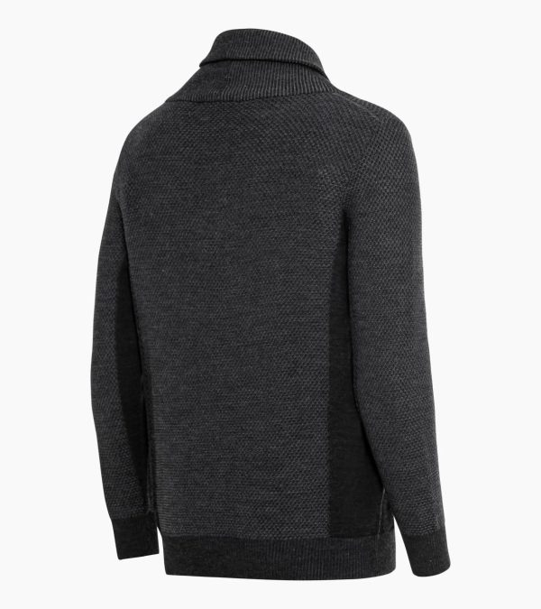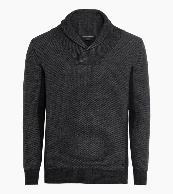 Exclusive designer pullover for men made of merino wool in a dynamic structured knit. Shawl collar with buttons and modern designer details. Made in Italy.Modern dynamics and timeless comfort – the luxurious Porsche Design Shawl Collar Sweater effortlessly combines apparent opposites in a stylish design. This knitted pullover made of soft merino wool is a limited edition item produced in Italy. A warming and stylish shawl collar gives the straight-cut men’s pullover a relaxed look. The striking cut combines a tailored waffle pattern with contrasting panels in smooth or ribbed knit, adding a sporty and modern look. Rubberized Porsche Design buttons and a hand-sewn metallic PD icon on the hem of the merino sweater provide the final, exclusive touch.