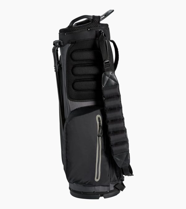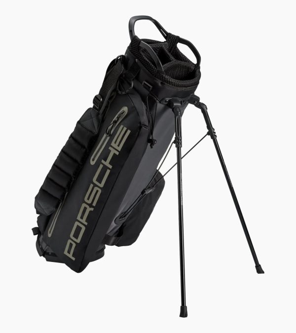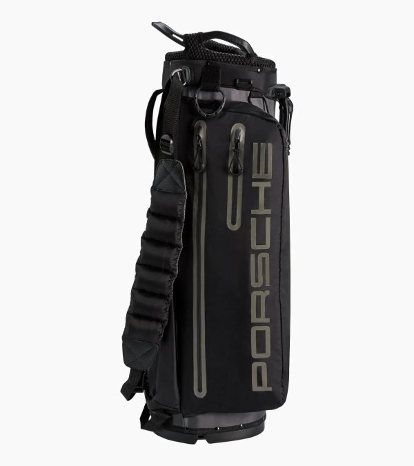 Water-repellent Porsche golf stand bag with 4-way divider, comfortable carrying system and practical pockets and holders.This golf stand bag is made of coated, water-repellent material and is ready for use in any weather. Clubs can be optimally organised thanks to its spacious 4-way divider. Thanks to the invisible integrated stand system and the balanced, adjustable carrying system, the bag guarantees high functionality and comfort. Five pockets and additional umbrella, glove and towel holders on the outside of the stand bag offer sufficient storage space for all the essentials. There is a ‘PORSCHE’ silicone print on the side.