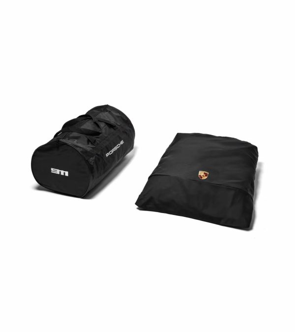 Perfect-fit outdoor car cover with full-color Porsche Crest, breathable and water-repellent, with rear license plate window, anti-theft protection, and handy bag.