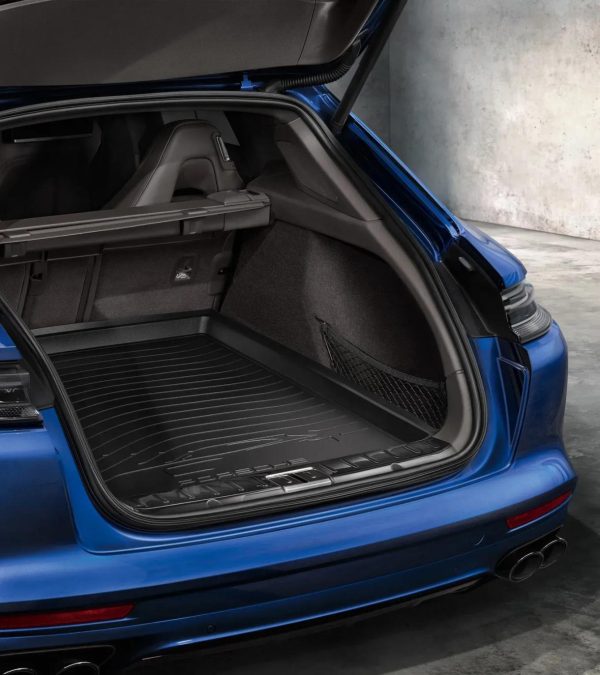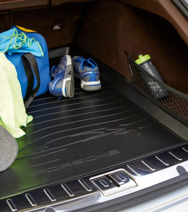 Custom-fit Porsche luggage compartment liner in black, featuring a vehicle silhouette and “PORSCHE” logo, water-resistant and washable for added durability.