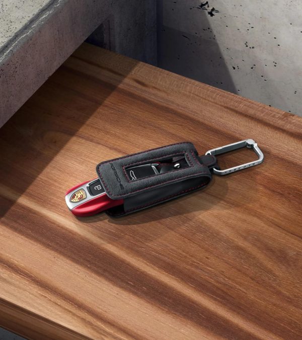Crafted from high-quality black Race-Tex, this item offers a bold and durable design. The lanyard and side bolsters are made from premium black leather, providing a refined contrast. Detailed with decorative stitching in carefully selected colors, it features the unmistakable PORSCHE logo, adding a touch of performance-inspired luxury to your collection. Perfect for those who appreciate both style and functionality.