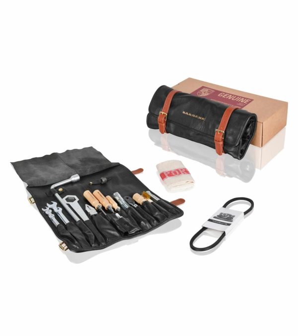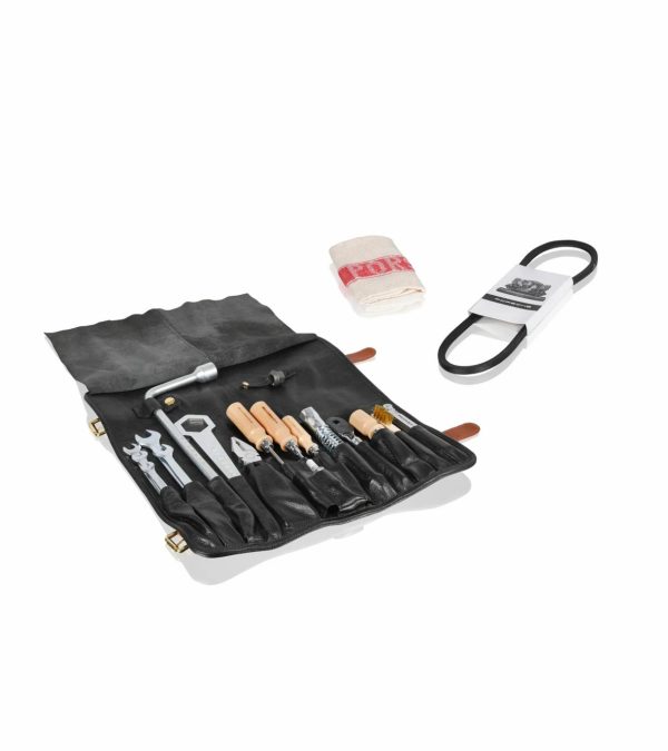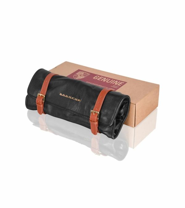Porsche Classic tool bag; suitable for all Porsche 356 from model years 1950 to 1965. Contents: 5x double open-ended spanner (one each: 8×9, 10×11, 12×13, 14×15 and 17×19), 1x wheel nut spanner crank, 1x special spanner size 36, 1x combination pliers, 1x long screwdriver, 1x Phillips screwdriver B2, 1x pull-off lever for hub cap, 1x spark plug socket spanner, 1x spark plug ratchet spanner, 1x stubby screwdriver, 1x brush, 1x feeler gauge, 1x wheel nut, 1x narrow V-belt, 1x spark plug, 1x cleaning cloth. Based on original tools and the driver’s manual, the tool bag for your 356 features a black real leather design with brown leather straps and the historic Porsche logo. At the same time, the tools combine improved functionality with original dimensions – each piece carrying Porsche lettering. Our tool bags always used to include an original wheel nut and spark plug – we have maintained this tradition along with the traditional packaging.